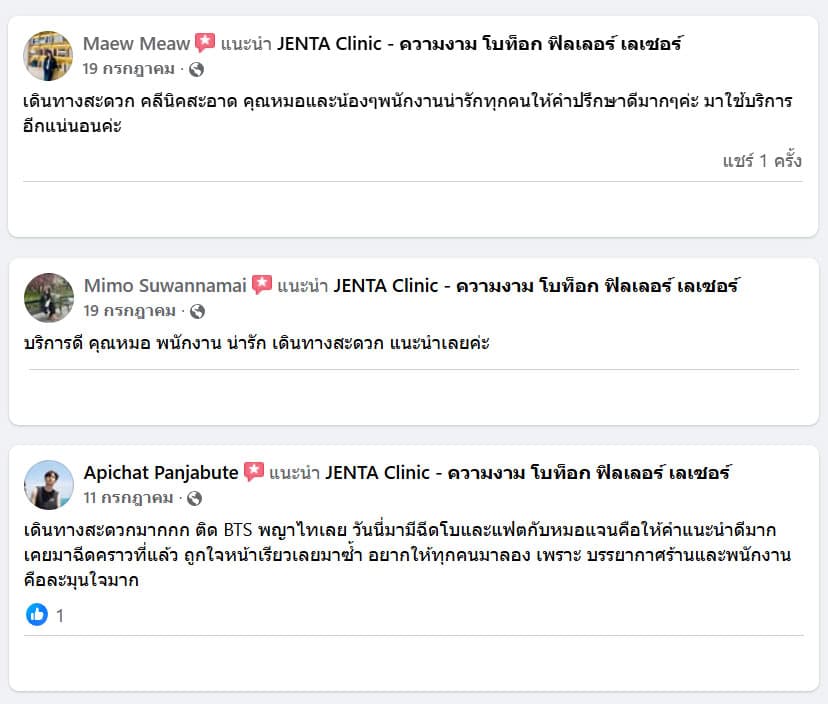 Petronela GaborTrustindex ตรวจสอบว่าแหล่งที่มาดั้งเดิมของรีวิวคือ Google Clinica di bellezza molto affidabile, personale competente, risultato molto naturale grazie ❤️🫰 Jamjun WilaTrustindex ตรวจสอบว่าแหล่งที่มาดั้งเดิมของรีวิวคือ Google คุณหมอน่ารัก พนักงานทุกท่านแนะนำดี คลีนิคสะอาด มีคุณภาพค่ะ JakeTrustindex ตรวจสอบว่าแหล่งที่มาดั้งเดิมของรีวิวคือ Google A fantastic clinic. Friendly and professional staff who really look after returning customers. I will continue to come back. Thank you! J PTrustindex ตรวจสอบว่าแหล่งที่มาดั้งเดิมของรีวิวคือ Google คลินิกสะอาด หอม คุณหมอกับพี่ๆใจดี ไม่ยัดเยียดค่ะ rare item มาก🥹 jessica bauerTrustindex ตรวจสอบว่าแหล่งที่มาดั้งเดิมของรีวิวคือ Google พนักงานกับคุณหมอให้บริการและคำแนะนำดีมากค่ะ Nuntaphorn BoriwathanantTrustindex ตรวจสอบว่าแหล่งที่มาดั้งเดิมของรีวิวคือ Google คุณหมอน่ารักและใจดีมากค่ะ พนักงานบริการดี กลับมาใหม่แน่นอนค่ะ kikzeze PornpimonTrustindex ตรวจสอบว่าแหล่งที่มาดั้งเดิมของรีวิวคือ Google มา follow up กับคุณหมอ หลังจากทำไป 3 อาทิิตย์ผลลัพดีมากค่ะ Hom NarukTrustindex ตรวจสอบว่าแหล่งที่มาดั้งเดิมของรีวิวคือ Google มาเติม juvelook กับ filler ไว้ใจคุณหมอแจนค่ะ ทำแล้วสวย คุ้มค่าแน่นอน Maria OsinaTrustindex ตรวจสอบว่าแหล่งที่มาดั้งเดิมของรีวิวคือ Google Great clinic! I’ve been here several times for different procedures for my face - the result is beautiful every time!!! I recommend this clinic for both Thai people and foreigners, doctor speaks English 😊 Atitiya PataraputtinanTrustindex ตรวจสอบว่าแหล่งที่มาดั้งเดิมของรีวิวคือ Google ของแท้ และราคาไม่สูง คุ้มค่าทุกครั้งที่มา