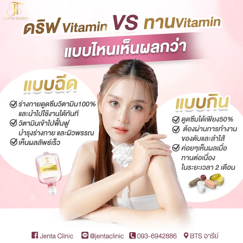 ที่ JENTA Clinic เราใช้วิตามินคุณภาพสูง พร้อมดูแลโดยแพทย์ทุกเคส เพื่อให้คุณมั่นใจได้ว่าทุกหยดของวิตามินคือการบำรุงที่แท้จริง